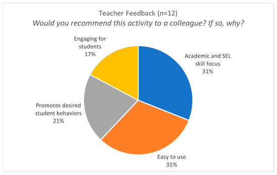Throughout field testing, teachers’ top-ranked activities also promoted student behaviors that were important to teachers, such as higher participation and collaboration. The survey that we used to collect feedback from teachers included a variety of questions about uptake. For example, one question asked teachers if they thought their colleagues would want to use this activity in their classrooms. When teachers responded affirmatively, the reason given most often was because the skills the activity targeted would promote desired student behaviors (see Figure 2). To that end, we included a support card to help teachers understand which activities they can use depending on the student behaviors they seek to promote in their classroom. For example, if a teacher wants to promote collaborative behavior, she could practice strategies that target prosocial behaviors and remind students to use those skills during group work.