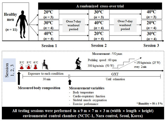 The subjects in this study were healthy males (n = 11) with no history of smoking and orthopedic or medical diseases in the past year. The physical characteristics of the subjects are shown in Table 1. A total of three graded exercise tests (GXTs) under various thermal stress conditions (30 °C and 40 °C) and at ordinary temperature (20 °C) were conducted. Environmental conditions were randomly selected, and each condition was set up with a wash-out period of 2 weeks. We explained the experiments and possible side effects to all subjects prior to the start of the study and obtained written consent for participation. This study was approved by the Institutional Review Board of Konkuk University (7001355-201805-HR-241) in Korea and was conducted in accordance with the provisions of the Declaration of Helsinki.