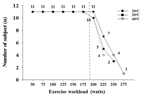 The study design is illustrated in Figure 1. All subjects visited our laboratory four times during the experimental period. Subjects’ body composition was measured during the first visit. To minimize the adaptation effect, thermal stress conditions (30 °C and 40 °C) and ordinary temperature condition (20 °C) were randomly selected, and each environmental condition had a wash-out period of at least 1 week. During the experiment, all subjects were allowed to rest for 30 min in each environmental condition, and then the dependent parameters, including body temperature, cardiorespiratory function, skeletal muscle oxygenation, and exercise performance, were measured. All subjects performed GXTs in each environmental condition using a cycle ergometer (Monark ergomedic 828E, Monark, Varberg, Sweden). The GXT protocol was started at 300 kg·m·min−1 (50 W), and the exercise load was increased by 150 kg·m·min−1 (25 W) every 2 min; the pedaling speed was set to 60 rpm. For data acquisition during exercise, cardiorespiratory function parameters and skeletal muscle oxygenation profiles were measured in increments of 10 s, and the average value for every 2 min in each section was calculated as the measured value. Data processing for dependent parameters related to cardiorespiratory function and skeletal muscle oxygenation profiles at each exercise intensity during GXT was performed up to 175 W, the intensity at which all subjects performed GXT (Figure 2). Data after 175 W were used only to measure and evaluate exercise performance. Blood lactate level was measured every minute during GXT, and the average value for every 2 min in each section was used. Body temperature was measured at rest and immediately after GXT. All testing sessions were performed in a 9 m × 7 m × 3 m (width × length × height) environmental control chamber (NCTC-1, Nara Control, Seoul, Korea). The chamber was used to create thermal stress conditions (30 °C and 40 °C) and ordinary temperature condition (20 °C). Humidity was maintained at 50 ± 5% in all the different environmental conditions.