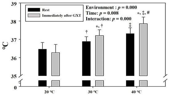 Changes in body temperature at rest and immediately after GXT (mean ± standard deviation). GXT: graded exercise test; a: significant difference immediately after GXT; *: significant difference between rest and immediately after GXT; †: significant difference between 20 °C and 30 °C; ‡: significant difference between 20 °C and 40 °C; #: significant difference between 30 °C and 40 °C.
