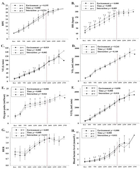 As shown in Figure 4, there was a significant interaction between environmental conditions and time in HR (p = 0.009), VE (p = 0.002), oxygen pulse (p = 0.044), VCO2 (p = 0.018), and blood lactate level (p = 0.011). Post hoc analysis revealed that HR, VE, and blood lactate levels showed a significant increase at almost all exercise loads as thermal stress increased (p < 0.05). Oxygen pulse was significantly lower at 40 °C than at 20 °C (p < 0.05). VCO2 showed a significant decrease at 40 °C compared with that at 30 °C and 20 °C (p < 0.05). No significant interaction between environmental conditions and time was observed for RPE, VO2, and RER.