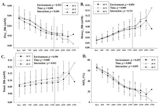 Figure 5 depicts the changes in skeletal muscle oxygenation profiles at rest and during GXT under various thermal stress conditions (30 °C and 40 °C) and ordinary temperature (20 °C). There was a significant interaction between environmental conditions and time in Total_Hb (p = 0.011), but post hoc analysis did not show any difference in Total_Hb between environmental conditions at each time point. No significant interaction between environmental conditions and time was observed for Oxy_Hb, Deoxy_Hb, and StO2.