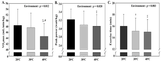 Changes in exercise performance parameters (mean ± standard deviation): (A) change in VO2max, (B) change in peak power, and (C) change in exercise time to exhaustion are shown. GXT: graded exercise test; VO2max: maximal oxygen uptake. †: significant difference between 20 °C and 30 °C; ‡: significant difference between 20 °C and 40 °C; #: significant difference between 30 °C and 40 °C.