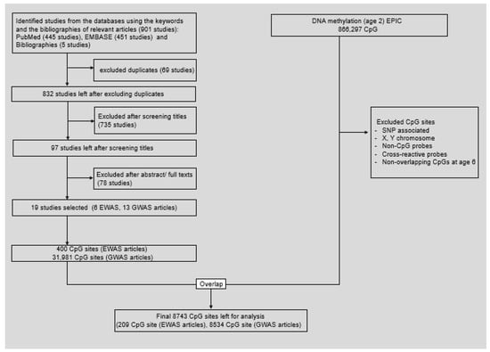A total of 400 CpG sites were selected from 6 EWAS [,,,,,]. Additionally, a total of 31,981 CpG sites were selected, which were annotated to 835 genes reported from 13 GWAS after excluding duplicate genes [,,,,,,,,,,,,]. As a result, 8743 CpG sites were finally selected (Tables S2 and S3).
