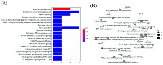 Reactome pathway enrichment analysis of the greenness-associated genes, which shows the top 20 pathways. (A) The enrichment scores in the Reactome pathway analysis of the greenness exposure-related genes. (B) The network of the most enriched pathways of the greenness exposure-related genes. Larger nodes represent higher enrichment scores that represent different enrichment modules.