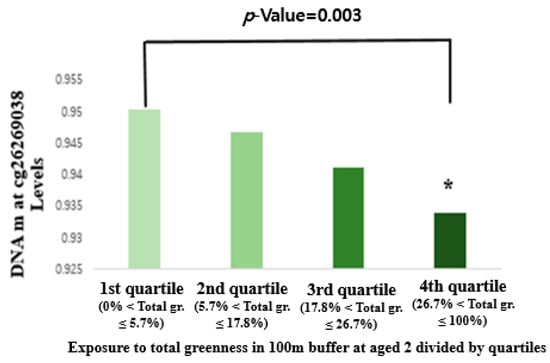 The LSMEANS of DNA m at cg26269038 levels in four quartiles of exposure to greenness among children. * Represents significant differences between a quartile and the lowest quartile, with p-values < 0.05 considered statistically significant.