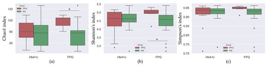 Chao1 (a), Shannon’s (b), and Simpson’s (c) diversity indices of saliva microbiomes in each sample group. In each panel, the PPG and NG groups divided by Hb1Ac and FPG levels are shown separately. The boxplots with red and green colors indicate 25% and 75% of the indices in PPG and NG groups, respectively. The diamond symbols are the outliers of the boxplot. The asterisks in (a,b) panels indicate the categories in which KS test reports have a significant difference (p < 0.05).
