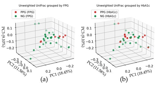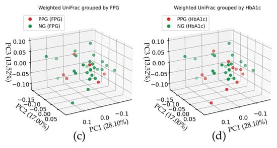 Principle coordinate analysis (PCoA) based on the unweighted (top panels) and weighted (bottom panels) UniFrac distance matrices. The red and green dots represent the PPG and NG groups, respectively. The colored symbols are shaded according to their positions on the 3D plot. The top panels (a,b) show the PCoA of unweighted UniFrac indices, while the bottom panels (c,d) show those of weighted UniFrac indices. The samples in the left panels (a,c) are PPGFPG and NGFPG groups, whereas those in the right panels (b,d) are based on the HbA1c level.