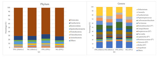 Bar plots of taxonomic profiles of patients in PPG and NG groups at the phylum level (a) and the genus level (b). Left to right bars in each panel shows the relative abundances of PPGHbA1c, NGHbA1c, PPGFPG, and NGFPG, respectively. Phyla and genera with the relative abundance below 1% are not directly shown in the figure, but included in others. H * and F * in parentheses of the right panel indicate the genus with significant difference (independent t-test with p < 0.05) between two groups (PPG and NG) in cases of using the HbA1c and FPG levels as criteria, respectively.