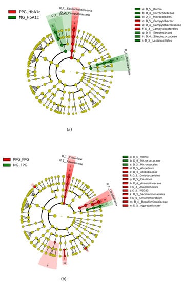 Cladograms from LEfSe analysis of saliva bacterial genera between PPGHbA1c and NGHbA1c (a) and between PPGFPG and NGFPG (b). The red and green labels show the genus of bacteria with significantly higher abundance in PPG and NG groups, respectively.