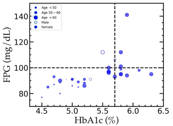The distribution of blood sugar levels in studied population. The open and solid symbols represent male and female, respectively. Sizes of the symbols are related to ages of the participants. The vertical line at HbA1c of 5.7% indicates the HbA1c criterion used to divide PPGHbA1c and NGHbA1c groups. The horizontal line at FPG of 100 mg/dL is used to classify PPGFPG and NGFPG groups.