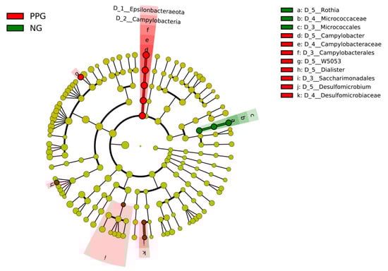 Cladogram from LEfSe analysis of saliva bacterial genera in PPG and NG groups classified by using both HbA1c and FPG levels. Green and red colors indicate the bacterial genera with higher abundance in PPG and NG, respectively.