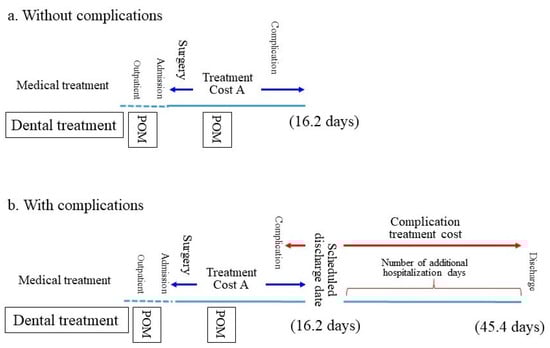 In general, the duration of hospitalization tends to be short if the patient does not develop any complication. In such cases, the hospitalization fees include the fees for the treatment of the underlying disease (cancer-related treatment fees) and the comorbidities (Treatment Cost A). If the patient develops any complications following surgery, treatment for the complications is provided in parallel with the POM-related treatment. The patient is discharged after recovering from the complication. The period of hospitalization is prolonged if the patient develops complications, and the treatment costs for the complications are added to Treatment Cost A in such cases (Figure 2). However, it is not easy to segregate each treatment cost item; moreover, it is difficult to extrapolate the treatment cost for pneumonia only.