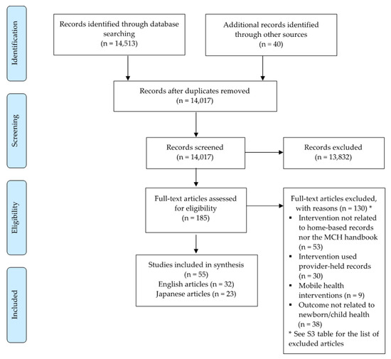 R.R.C. and J.L.S. obtained full-text articles from the University of Tokyo Library system, while M.K.K. did so from the Keio University KOSMOS system and the National Diet Library Online. We further removed 130 articles (Table S1) from the list for the following reasons: neither related to home-based records nor the MCH handbook (n = 53), provider-held records (e.g., electronic medical records) (n = 30), mobile health interventions (n = 9), and not related to newborn/child health outcomes (n = 38). Overall, we included 55 articles (23 articles in Japanese) in the narrative synthesis. Figure 1 shows the PRISMA flow diagram of the screening process.