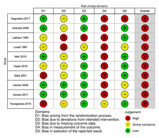 We noted differences in the risk of bias across the studies. Figure 2 shows the risk of bias assessment for the 10 RCTs included in this review [29]. Following the RoB 2 algorithm, all selected studies had a high overall risk of bias, mainly owing to bias from the randomization process, blinding/masking not described or not possible for the said intervention, and selective outcome reporting. For non-RCTs, the results of the risk of bias assessment are shown in Table S5. We found some methodological considerations and critical potential confounding variables neither measured nor adjusted statistically.