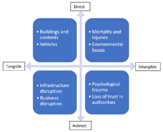 It has been argued that flood risk management is usually measured as direct property and infrastructure losses, since these are the most important input for cost–benefit analysis to guide the government bodies to invest in flood risk management strategies [5]. However, the impacts of flooding on urban populations are multi-faceted and wide-ranging. It is well-known that floods also have enormous impacts on people, both directly and indirectly (see Figure 1). Distinctions must be made between direct/indirect and tangible/intangible flood damages. Direct damage becomes immediately visible in the affected areas due to close physical contact with floodwater, while indirect damage emerges with a time delay and/or outside the area affected by floods [6].