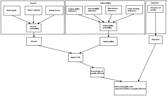 The quantification of the benefits of flood risk prevention measures is still an unresolved challenge in disaster management research. In particular, there is no clear flood risk management to quantify the effect of interventions in reducing the flooding impacts on people including the effects on the affected population’s mental health. The most widely adopted framework in flood risk reduction is represented as the calculation of the expected damages as a function of flood hazard, physical vulnerability and exposure [30]. According to this framework, flood hazard is characterized by specific return periods—an estimate of the likelihood of the flood. Moreover, together with the vulnerability, it is usually expressed as an index, while the exposure is expressed with the unit(s) of measurement of the elements at risk, in physical or monetary terms. However, floods can impact socio-ecological systems in various forms, and therefore this framework is limited to assess damages to constructed infrastructure only. Furthermore, there have been a few other attempts to provide such a holistic risk assessment (see [31,32]), yet, these methods primarily focus on assessing direct tangible costs, since there is only enough relevant information to justify decisions regarding structural risk reduction measures. The main challenge with traditional frameworks is that they neglect the fact that the magnitude of flooding costs is determined by the adaptive behaviour of communities to absorb the flood hazards. It is obvious that the human dimension of vulnerability must be addressed as one of the main elements of the flood risk. The human aspect of vulnerability relates to the ability to cope with the hazard after a flood and the capacity to adapt to the flood hazard before the event [33]. More recently, emphasis has shifted from just being prepared, informed and minimising the dimension of vulnerability, to strategic proactive planning and management. There are two main reasons for this shift in recent flood risk management: