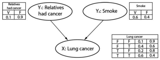 As can be observed, a conditional probability table (CPT) is attached to each node. The CPT on each node is associated with the conditional probability distribution, as given in Equation (1). The CPTs (or conditional probabilities) can be estimated from the observed data or expert opinions [14,48]. A link (or ‘edge’) between two nodes represents a probabilistic dependency between the linked nodes. The links are shown with an arrow pointing from the causal node(s) ( in Figure 3) to the effect node (X: Lunge cancer in Figure 3). There must not be any directed cycles: one cannot return to a node simply by following a series of directed links. Nodes without a child node are called leaf nodes, nodes without a parent node are called root nodes (), and nodes with parent and child nodes are called intermediate nodes. In other words, a BN represents dependence and conditional independence relationships among the nodes using joint probability distributions, with an ability to incorporate human oriented qualitative inputs. The method is well established for representing cause–effect relationships.