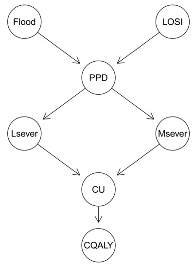 Static Bayesian network to evaluate the effect of flood interventions upon mental health where LOSI indicates the loss of sentimental items, PPD indicates the prevalence of probable depression, Msever and Lsever indicate the more severe depression and less severe depression respectively, CU indicates the change in utility and CQALY indicates the change in QALY.