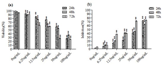 Inhibitory effect of the essential oil from C. ambrosioides on proliferation of the L02 cells. L02 cells were treated with the essential oil for 24, 48, and 72 h, and cell viability was determined by MTT assay. (a,b) represented the cell viability and inhibition of the L02 cells after being treated with the essential oil at different concentrations for different time respectively. The graphical plots derived from three independent experiments are shown, and the numerical values represent the means ± SEM (** p < 0.01, compared with the negative control).