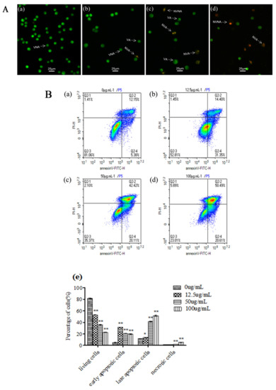 For comparison with the negative control group (Figure 2Aa), the VNA cells, VA cells, NVA cells, and NVNA cells of the L02 cells that had been treated for 24 h were observed with AO/EB double staining by fluorescence microscopy (Figure 2Ab–d). The number of NVA cells increased with the increase in the essential oil concentration. Then, L02 cell apoptosis or necrosis was analyzed by staining with Annexin-V/PI after the essential oil treatment (Figure 2B). The occurrence rate of the apoptosis cells was significantly increased in a concentration-dependent manner in the treated L02 cells (p < 0.01). The essential oil at concentrations of 12.5 and 50 μg/mL induced VA cells among the L02 cells at a higher proportion. In addition, the essential oil could also induce L02 cell necrosis, and had a significant difference from the negative control group (p < 0.01).