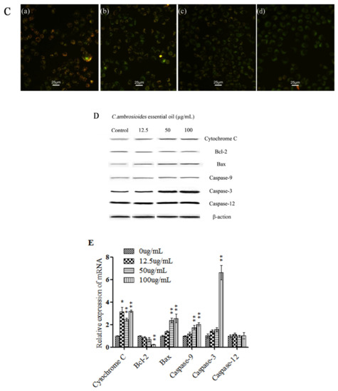 C. ambrosioides essential oil induced apoptosis in the L02 cells. (A) AO/EB double staining. (a)–(d) represented the VNA cells, VA cells, NVA cells, and NVNA cells of the L02 cells that had been treated with the essential oil for 24 h at the concentrtion of 0 µg/mL, 12.5 µg/mL, 50 µg/mL and 100 µg/mL respectively. (B) Cells were harvested, stained with Annexin V/PI, and data were acquired by flow cytometer. (C) MMP using JC-1 dyeing with fluorescence microscopy. (a)–(d) represented the the MMP of the L02 cells that had been treated for 24 h with DMSO, the essential oil at the concentrition of 12.5 µg/mL and 50 µg/mL, carbonyl cyanide-p- chlorophenyl hydrazone (CCCP) respectively. (D) Apoptosis related protein expression was detected by Western blot. (E) The mRNA expression level of apoptosis related gene was detected by qPCR. Graphical plots derived from three independent experiments, numerical values represent means ± SEM (* p < 0.05, ** p < 0.01, compared with the negative control). Note: VNA = living cells, VA = viable apoptotic cells, NVA = non-viable apoptotic cells, and NVNA = non-viable non-apoptotic cells.