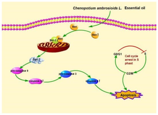 In conclusion, our study demonstrated that C. ambrosioides essential oil had a certain cytotoxic effect on normal human liver L02 cells, and could also induce L02 cell cycle arrest at the S phase. It induced L02 cells apoptosis through the endogenous mitochondrial pathway (Figure 3). In view of the toxic effect of the C. ambrosioides essential oil on normal cells, it should be used cautiously. This study provides new insights for the food safety evaluation and rational utilization of the resources of C. ambrosioides.