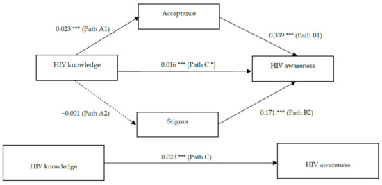 The mediation pathways of HIV-related knowledge, attitude (acceptance and stigma) and awareness. * p ≤ 0.05; ** p ≤ 0.01; *** p ≤ 0.001.