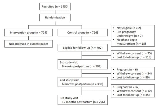 Looking specifically at the measurement of PhA in pregnancy or postpartum, only a few studies have sought to establish reference values [] and/or explored changes in PhA over time in relation to other body composition variables [,,]. These results are not externally generalisable as the studies have had small sample sizes [,] or described women who were predominantly underweight []. Therefore, the aim of this study was to describe and explore the evolution of PhA during the first year postpartum in a Belgian cohort of women who had excess GWG. A secondary aim was to examine associations between PhA, BMI and potential explanatory variables during the first year postpartum.