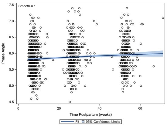 After examining other studies of PhA during the postpartum timeframe, Shaikh et al. [] reported on the evolution of PhA during pregnancy and until 12–18 weeks postpartum in a Bangladeshi population. The PhA in their sample was 6.1° in early pregnancy, decreasing to 5.7° late in pregnancy and increasing again to 5.9° at 12–18 weeks postpartum. Their study population of women was characterised by short stature, low body weight and experiencing their first pregnancy at a young age. Although the sample size was large, with 1141 measurements recorded postpartum, the mean BMI was 19.2 (SD 2) kg/m2, which is considered underweight by European standards. Overall, 46.1% of the Bangladeshi cohort were <20 years old at 12–18 weeks postpartum compared to our median age of 31.2 years at delivery. Of note, the authors detected age-related differences in BIA values, whereby PhA was generally lower among adolescents compared to older pregnant women, which is likely attributable to maturational differences of smaller body size and lower lean mass between younger and older women, as younger women grow towards peak stature and fat-free mass. The authors suggest the decrease in PhA in the third trimester, which was not observed in the better-nourished European pregnant populations [,], possibly indicates a more compromised body-cell mass profile at the outset of pregnancy and with advancing gestation. It also underlines the fact that BIA values are population-specific []. In a small USA-based study of only 15 women who were assessed during each trimester of pregnancy and at 8−10 weeks postpartum, Lukashi et al. [] found that PhA did not change significantly during pregnancy and postpartum (staying stable at 6.6°). This was despite body weight and total body water (TBW) both progressively increasing during pregnancy and decreasing in the postpartum period, with the authors recommending that impedance vectors can be used to monitor changes in TBW during pregnancy and postpartum. The lack of change in PhA may have been due to the small sample size.