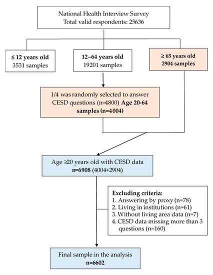 Figure 1 presents the procedure of participant enrollment. Since four additional module questionnaires were added in the age group of 12–64, only one-quarter of the participants were randomly selected to answer one module questionnaire. Hence, 4404 adults aged 20–64 years old answered the Chinese version of the Center for Epidemiological Studies Depression Scale (CESD). Thus, a total of 6908 adults aged 20 years and older were initially recruited in the study, and 6602 adults ≥ aged 20 years were finally included in the analysis after excluding those living in institutions (n = 61), not self-reported (n = 78), without living area data (n = 7), and missing more than three questions of CESD (n = 160).