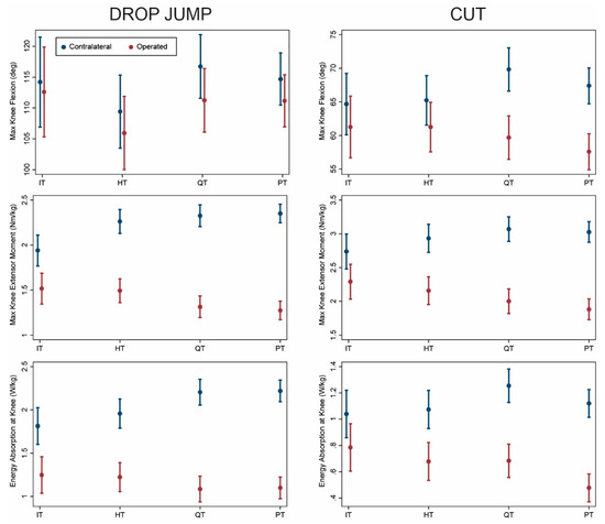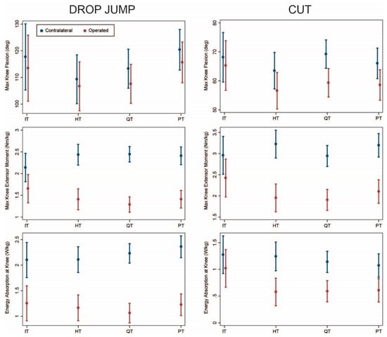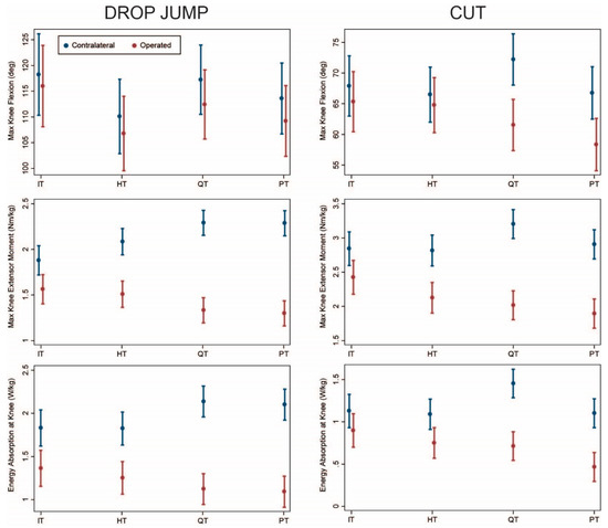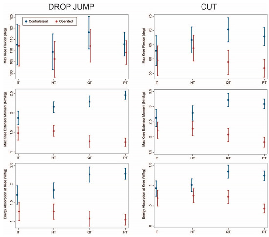 Comparing graft types after adjusting for covariates in the overall sample, dynamic knee extensor function of the operated limb was greatest in the IT group followed by the HT group as discussed below. Knee flexion angle was significantly lower on the operated vs. contralateral side for HT, QT, and PT during both drop jump (p < 0.03, Table 2) and cutting (p < 0.007, Table 3). All graft types exhibited lower knee extensor moments and energy absorption on the operated side during both movements (p ≤ 0.001). This asymmetry was most pronounced for QT and PT and least pronounced for IT (Figure 1). Loading on the operated limb decreased in order from IT to HT to QT and PT, while loading on the contralateral limb increased similarly. Asymmetry of kinetics (difference between sides) was significantly lower for IT compared with both QT and PT during both movements (p ≤ 0.005). Similar patterns were observed for HT but were less pronounced and not always statistically significant (p ≤ 0.07). Asymmetry differed between IT and HT only for knee extensor moments during both tasks (p ≤ 0.05), and no differences in asymmetry were observed between QT and PT (p ≥ 0.16).