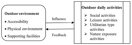 Outdoor daily activities are necessary for seniors’ physical and social needs []. There are broadly four types of ODAs for seniors: (1) social activities; (2) leisure activities; (3) activities of daily living, and (4) nature-exposure activities [,,,,]. These ODAs are essential for seniors’ quality of life.