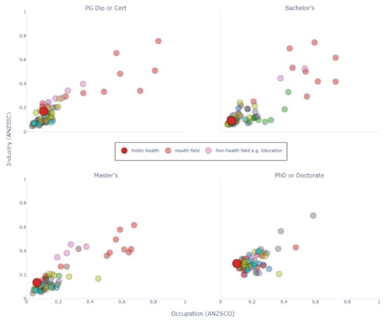 There are limitations to this work which warrant discussion. We were limited by using the ASCED classifications for fields of study. In some ways, this was advantageous, as it gave us a clear set of educational fields against which to compare our results, and many of these categories are intuitive, e.g., Business and Management, or Nursing. However, the codes we used for public health do not necessarily only include broad public health degrees such as the Master of Public Health, and this is something to acknowledge. For example, many of the common occupations that Bachelor’s public health students held were clinical occupations, and this would have meant these students had studied another degree to obtain these occupations. These may be a case of misclassification, or a double degree, or that several students had studied a clinical degree only to study an undergraduate public health degree after this. This lack of clarity is added to by the fact that Bachelor’s level was aggregated from four course levels, albeit Bachelors (Pass) Degree was the most common. These are important limitations in an otherwise robust, representative dataset of higher education graduations.