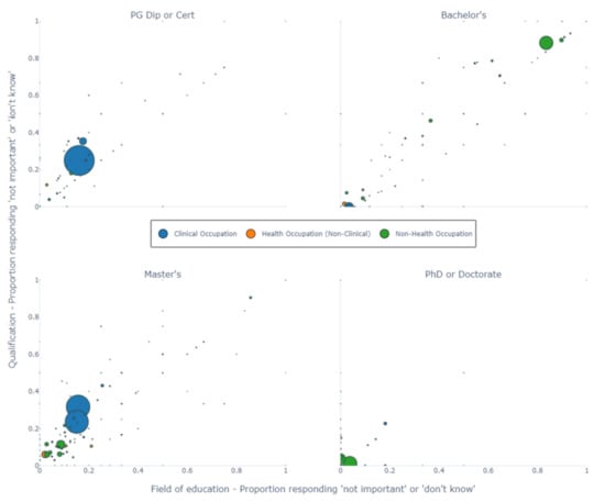 5]. However, our research highlights that those who have clinical occupations do not feel public health was as useful as those with non-clinical occupations, regardless of degree level. It is difficult to make a judgement about whether this is a serious issue or not, but it deserves more research. For example, consider a nurse who studied an MPH to signal to their employer that they wanted to advance their career. They may report that the field was not important for their occupation, but may still be grateful they studied the degree. Consider another example, where one doctor felt their degree was not important, another three regarded their degree as highly important, and use their knowledge every day for important decisions. Is this a trade-off that Schools of Public Health are happy to make? This evidence highlights a broader issue that may impact Schools of Public Health: students may have very different reasons for undertaking the same degree. Considering this, further research into student motivations may be particularly helpful.