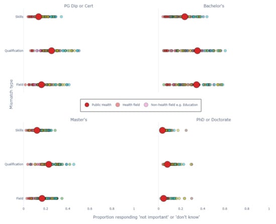 Despite public health graduates going into a variety of occupations, it appears that they find themselves well prepared for occupations. This is true in an absolute sense (on average, less than one in five graduates feels mismatched) and in a relative sense (public health cohorts report a level of mismatch similar to the average mismatch of other fields, or less than this). In this respect, public health is similar to business and management degrees, which seem to balance the trade-off between occupational variance and mismatch well. This seems a notable achievement and may reflect the choices in public health schools regarding a curriculum which is both relevant and broad, or the versatility of graduates in finding employment. There are areas with greater mismatch, and this is useful for students to know. For example, there is a greater degree of mismatch in public health degrees at the Bachelor’s level than other levels. This may be expected, as undergraduates and postgraduates competing for the same positions should tend towards postgraduates being awarded the position ceteris paribus. Therefore, this may be appropriate if this is understood by both educators and students.