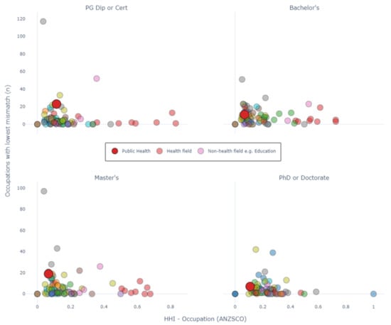 We represent our findings in two ways. Firstly, we present a table showing the occupations where public health graduates had the lowest proportion of mismatched students. This table aggregates all levels of education. Aggregating all levels of education assumes that there is only one set of occupational categories which all graduates are prepared for. This is likely an underestimate of the actual number of occupational categories (e.g., a program officer might have different positions for undergraduate and postgraduates, which are both coded as “Project or Program Officer”). Secondly, we compare public health cohorts to all other cohorts with level of education disaggregated and represent this using a scatter plot. In this plot, each point represents a field of education, the X-coordinate corresponds to the occupation HHI (as above), and the Y-coordinate corresponds to the number of occupations. Disaggregating by level of education assumes that there are four levels of occupational categories, one for each level of education. This is likely an overestimate of the number of occupational categories (e.g., it is unlikely that program officer positions are made distinct for Graduate Diploma, Master’s, Bachelor and PhD levels). We provided both sets of analyses as we felt both enable a better approximation of the actual number of occupational categories.