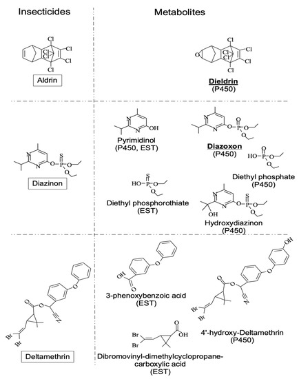 Main EST and P450 metabolites of aldrin, diazinon, and deltamethrin in insects.