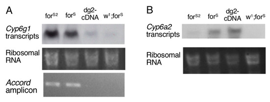 In D. melanogaster, several P450 genes have been linked to insecticide resistance, but we focused our work on two P450s that were found to be insecticide metabolizers: Cyp6a2 and Cyp6g1 [42,43]. We compared their expressions by Northern blot in rover and sitter strains.