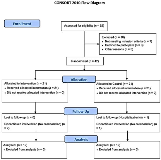 Thirty-eight patients (n = 38) completed the 7-day intervention and were included in the analysis. A CONSORT flow diagram can be seen in Figure 1. From patients excluded after randomization, one was due to hospitalization while three of them were excluded due to a lack of collaboration.
