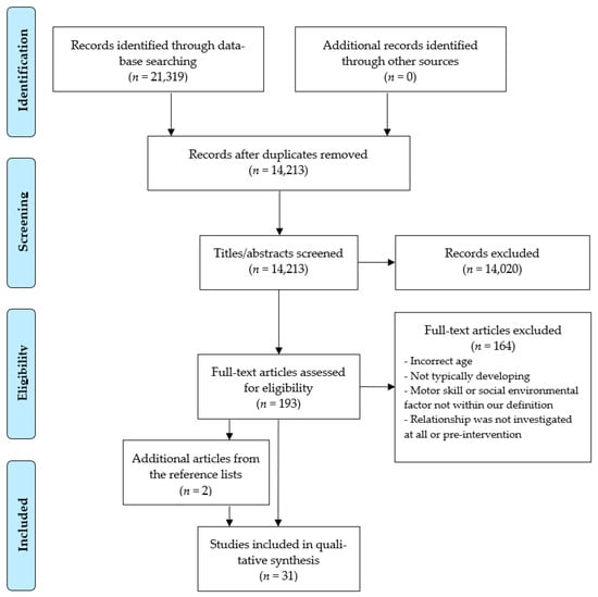 Studies were excluded if the motor performance or the social environmental factor in the study did not fit within our definition of these constructs. Physical fitness and its components did not fall within the scope of this review, and studies investigating physical fitness were therefore excluded. The terms “motor skills” and “physical fitness” are sometimes used interchangeably in the literature, but these constructs are clearly distinct. Physical fitness can be defined as a set of attributes related to the ability to perform physical activity and includes the components cardiorespiratory endurance, muscular endurance, muscular strength, body composition, flexibility, agility, and speed [26,27]. Social environmental factors that occurred prior, during or due to birth (e.g., prenatal or postpartum depression) were excluded. Studies that focused on atypical development were excluded, while studies that focused both on children with a typical and an atypical development were excluded if the groups were not investigated separately. Furthermore, case studies and reviews were excluded from this review.