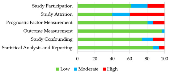 Percentage of included studies with a low, moderate, and high risk of bias assessed with the Quality of Prognosis Studies in Systematic Reviews (QUIPS) tool [27,28]. All the domains were assessed for all 31 studies, except the Study Attrition domain, which was assessed for five included studies.