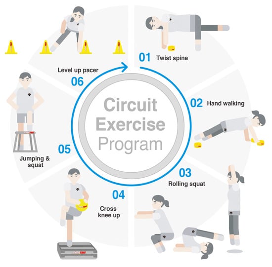 The CEP in this study utilized youth physical activity promotion programs and consisted of fitness movements to promote health and fitness elements of endurance, flexibility, strength, and power [12]. The CEP consists of six movements, as shown in Figure 1. All actions were performed in sequence and recorded in seconds increments at the end of all movements. Twist spine (flexibility): put one leg over the pelvis, fix it on the floor, and then move one bean bag while turning the upper body to the other side (two sets of three repetitions for each side left and right). Hand walking (strength): in the push-up posture, move one bean bag by hand to the tip of the toe in order and then return to the place (one set of two repetitions). Rolling squat (strength): prepare in a squat position, roll back until toes are over your head, and roll forward to squat position (one set of five repetitions). Cross knee up (endurance): first, cross-jump on the step box (10 repetitions) while holding the ball. Second, bend your knees and cross the ball diagonally (5 repetitions on each side alternately). Third, extend your knees and cross the ball diagonally (5 repetitions on each side alternately). Jumping and squat (power): first, jump on top of the box with both feet (five repetitions). Second, step up the box (5 repetitions). Level-up pacer (endurance): Shuttle run by touching the four cones standing at 1.5 m intervals in sequence.