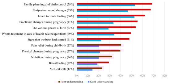 More than half of the women reported insufficient coverage on the topic of family planning (58%), infant formula feeding (56%), and postpartum mood changes (53%). Information about recommended medical tests had the lowest reported proportion of insufficient coverage (17%). For all topics, higher proportions of insufficient coverage were reported by the women with a poor understanding of information, compared to women with a good understanding (Figure 1).