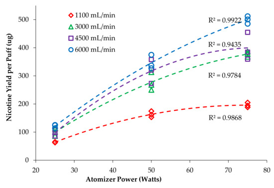The plateauing observed within a given flow rate (Figure 2) indicates there is a factor acting against mass transfer (vaporization) such as the wicking rate of the atomizer being unable to supply enough e-liquid to match the increasing power and thus limits the nicotine yield [24]. Another factor that could reduce nicotine yield is re-deposition of e-liquid vapor back onto the wick or inside of the atomizer [23]. It is possible that the kinetics of redeposition by molecular diffusion begin to match pace with vaporization of e-liquid when the vapor concentration reaches super saturation conditions that are certainly expected within the atomizer [17,25]. At high power and lower puff flow rates, vapor could condense and redeposit within the atomizer and be resorbed by the wick. Slower flow rates would result in higher vapor concentration and longer residence time in the atomizer, each of these would facilitate increased deposition within the atomizer due to Brownian motion [25].