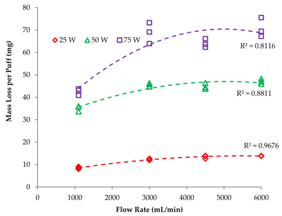 Effect of power on mass loss per puff for each trial at different flow rates.