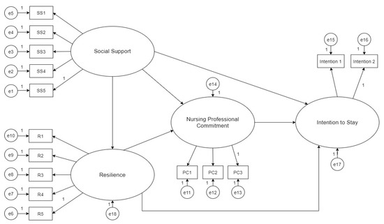 Based on the JD-R model, this study tested the model on factors affecting the intention to stay in newly graduated male nurses in Taiwan. We proposed the structural equation model where the relationships among social support, resilience, nursing professional commitment, and intention to stay were explored. Furthermore, the mediating effect of nursing professional commitment in the above relationships was tested. This study assumes that social support and resilience of newly graduated male nurses positively influence nursing professionals’ commitment and intention to stay. Nursing professional commitment is a mediator between social support and intention to stay; it also acts as a mediator between resilience and intention to stay. Nursing professional commitment positively influences intention to stay. These relationships are graphically presented in Figure 1.