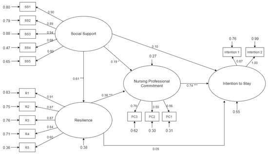 In addition, Fornell suggested that the composite reliability of potential variables must be greater than 0.6 [31]. In this study, the composite reliability of four latent variables (social support, resilience, nursing professional commitment, and intention to stay) were 0.93, 0.91, 0.67, and 0.93, respectively, all greater than 0.6. According to Fornell and Larker, the average variance extracted (AVE) of potential variables must be greater than 0.5 [32]. The results showed that only the AVE value of nursing professional commitment was 0.41, while the AVE values of other latent variables were greater than 0.5. Overall, the various model-fit criteria in this study were still above the standard; therefore, hypothesis H1 was supported.
