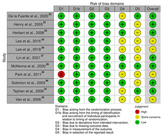 - Sterne, J.A.C.; Savović, J.; Page, M.J.; Elbers, R.G.; Blencowe, N.S.; Boutron, I.; Cates, C.J.; Cheng, H.-Y.; Corbett, M.S.; Eldridge, S.M.; et al. RoB 2: A revised tool for assessing risk of bias in randomised trials. BMJ 2019, 366, l4898. [Google Scholar] [CrossRef]