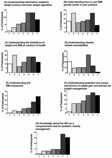 Baseline knowledge ratings are presented for each question in Table 4 and ratings or perceived change in knowledge are presented in Figure 2A–G. Baseline ratings were the lowest for “understanding the 4Ms framework” and “knowledge about the 5As as a comprehensive tool for pediatric obesity management”, while 77% of participants ranked their post-video change in knowledge for these questions as “moderately better” to “a great deal better.” Conversely, baseline ratings were the highest for “understanding how to use BMI growth charts in your practice” and “understanding the limitations of weight and BMI as markers of health”, while the majority of participants (49–57%) ranked their post-video change in knowledge for these questions as “no change” to “somewhat better.”
